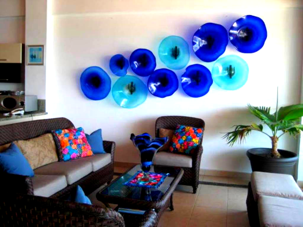 Our condo is equipped with everything you could think of in modern conveniences, luxury and comfort. The common living area has a comfortable living room section next to the large sliding doors. The living room wall is decorated with lovely Mexican plates, artfully arranged in a wave-like pattern. There is also another area for 60inch TV watching, with a comfortable couch. Artwork throughout the condo has been carefully chosen and purchased from local artisans, such as the sparkling and colorful stained glass mirror.