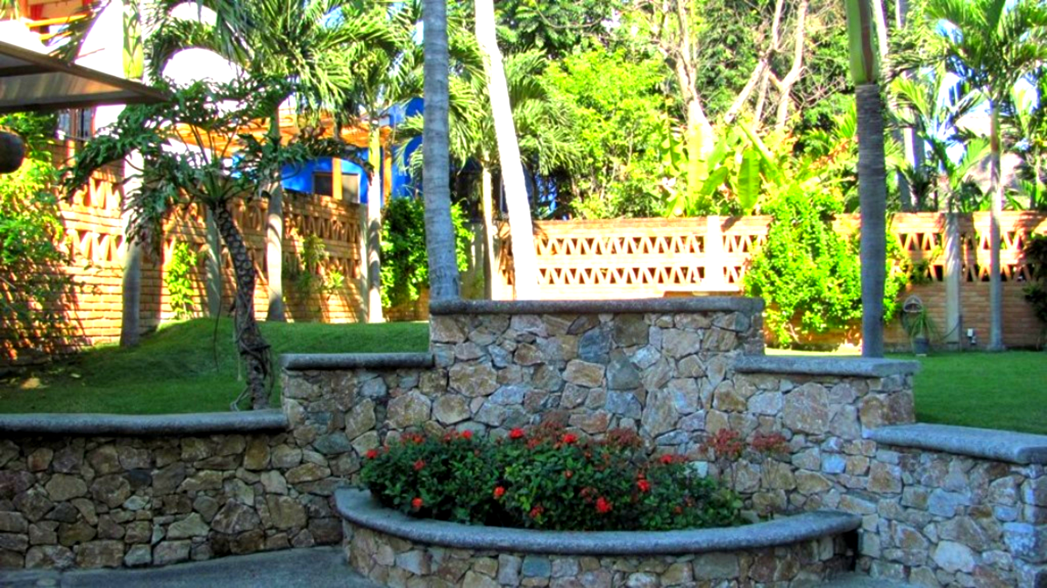 The grounds of Condo Albatros include a large, grassy area in the back of the property, a covered eating area in the front near the pool, and a convenient outdoor bathroom close to the pool. The pool actually sits right on the beach, over hanging the sand and waves when the tide in specially high. The pool surrounded by lounge chairs, drink tables and umbrellas. It is just steps down to the beach through the private beach door, parking is adjacent to the condo.